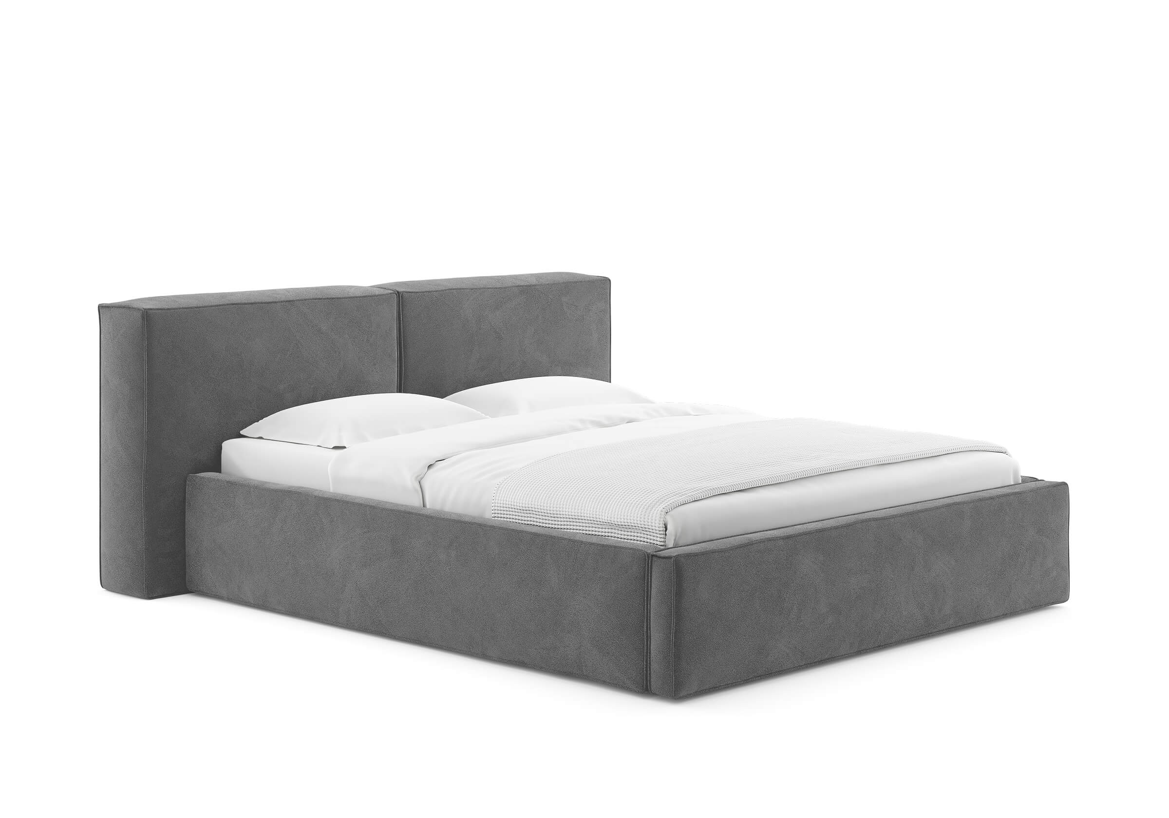 Кровать мягкая по всему периметру, без ножек - можно не бояться удариться мизинчиком) Изголовье в виде двух отдельных подушек с плоским широким верхом, на который можно положить телефон или планшет и не бояться, что ночью упадет на лицо. Дизайн с закосом под лофт, именно как я искал, в интерьер спальни вписался отлично. Сплю чуть больше полу года, за это время минусов не обнаружил. Сейчас вот вернулся за тумбами в том же цвете.